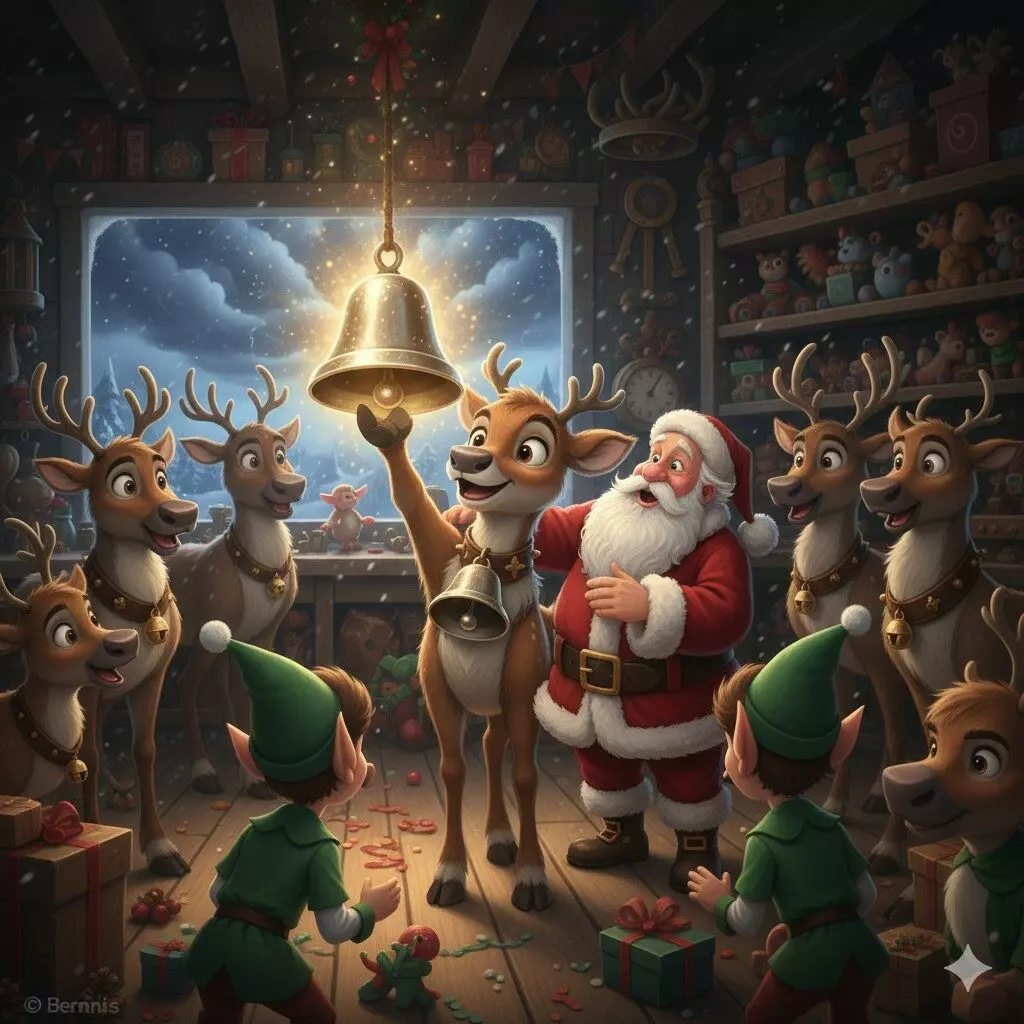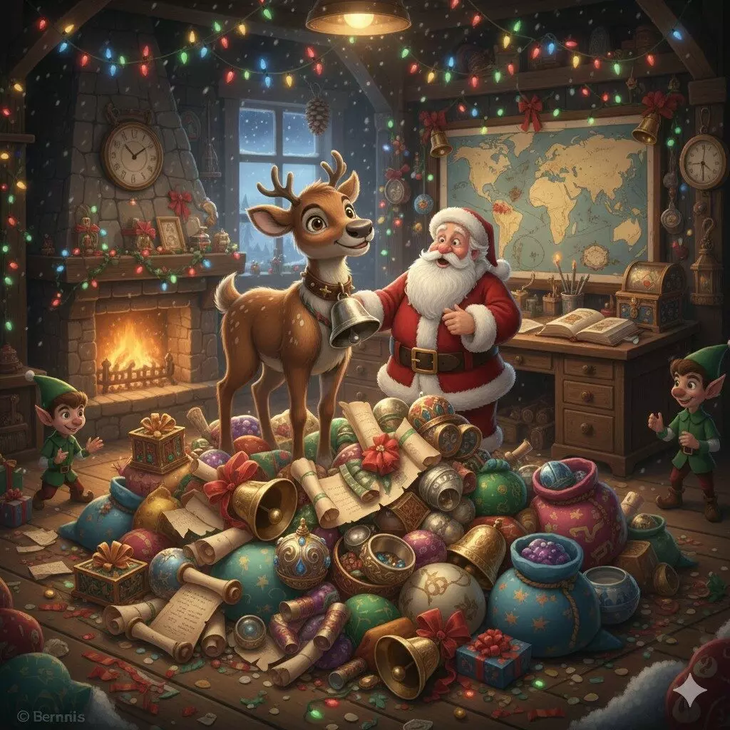 Gracias a la curiosidad de Bernie, el trineo pudo despegar a tiempo. Desde esa noche, Bernie no solo fue el reno decorador, sino el encargado oficial de cuidar los tesoros mágicos de Santa.